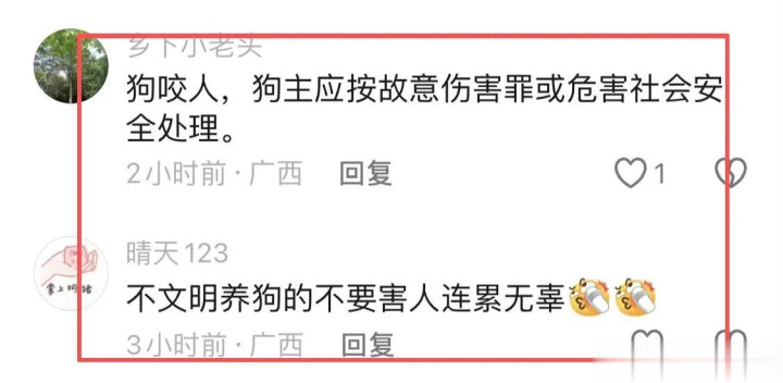 “狗咬人,其主人应该按照故意伤害处理才行,不文明养狗牵连无辜者。”